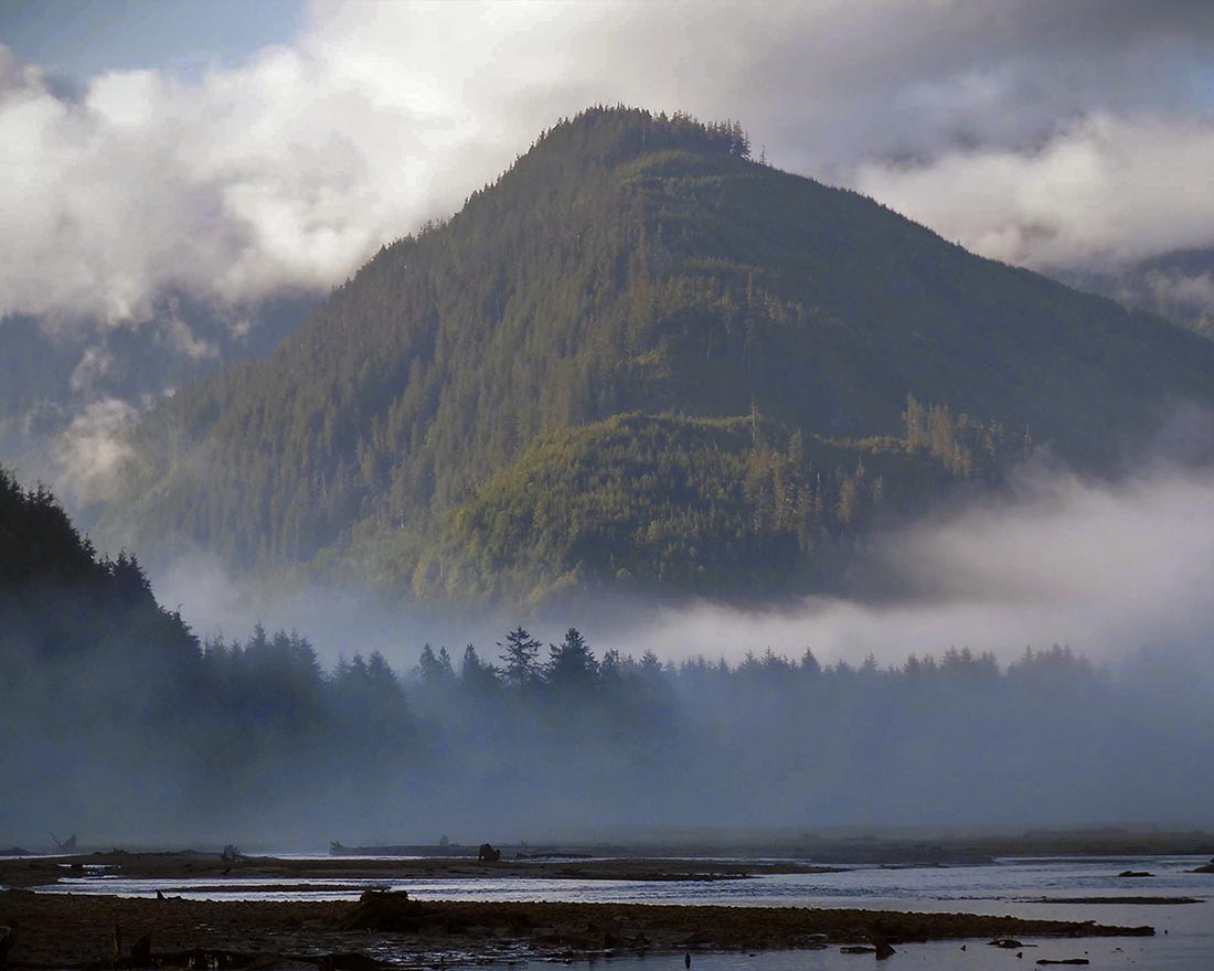 Knight Inlet Lodge is located in the southern reaches of the Great Bear Rainforest. This protected rainforest is one of the largest intact coastal temperate rainforests in the world. It has a moderate climate with four distinct seasons. The coast of British Columbia is known for high rainfall, which creates humid and wet conditions in the rainforest. The amount of rainfall in our location also contributes to the rainforest’s lush, green vegetation. Our location also experiences a large amount of tidal activity, which can create strong currents and waves . Tides here can reach up to 16 feet (5 meters) and are a result of the unique geography of the area.