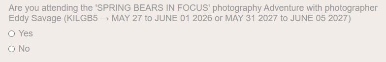 Availability of the ‘SPRING BEARS IN FOCUS’ Photography Adventure with Eddy Savage can be checked at this link (MAY 2027 Chart): www.grizzlytours.com/2027-availability/